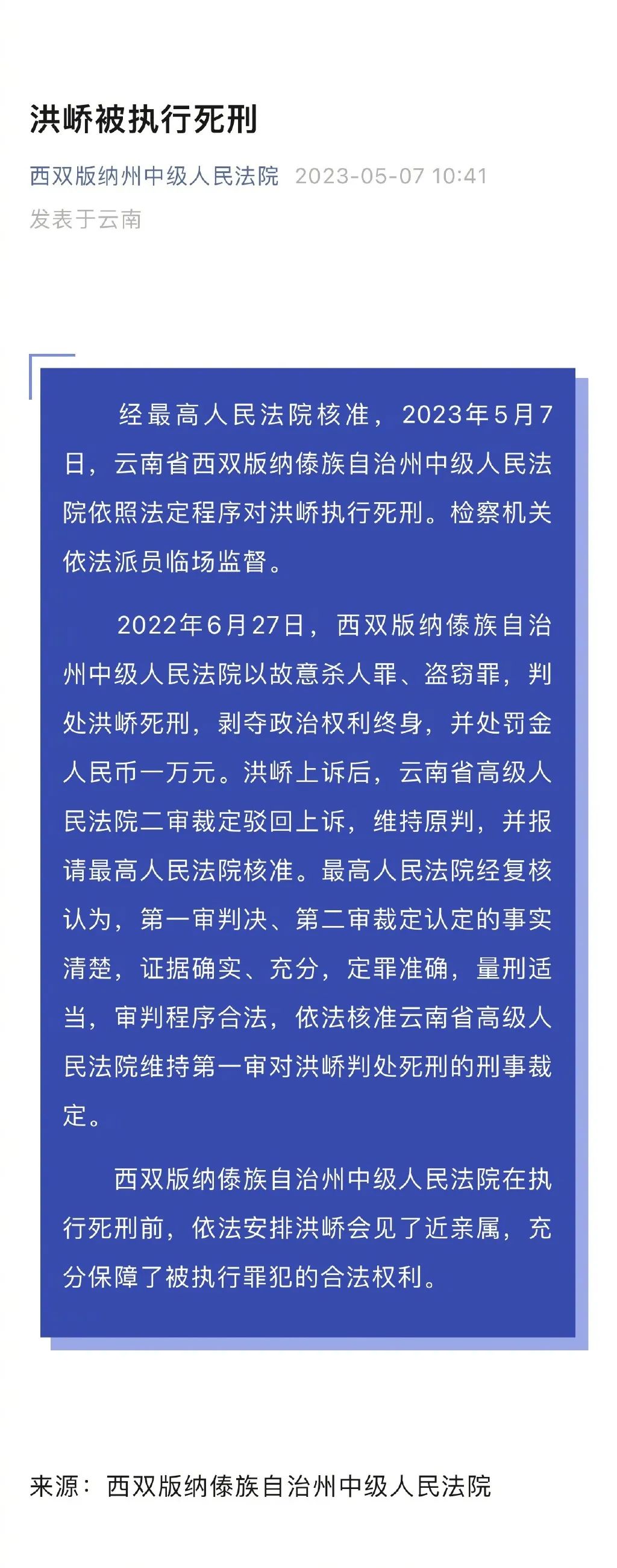 2022年6月27日,西双版纳傣族自治州中级人民法院以故意杀人罪、盗窃罪,判处洪峤死刑,剥夺政治权利终身,并处罚金人民币一万元。