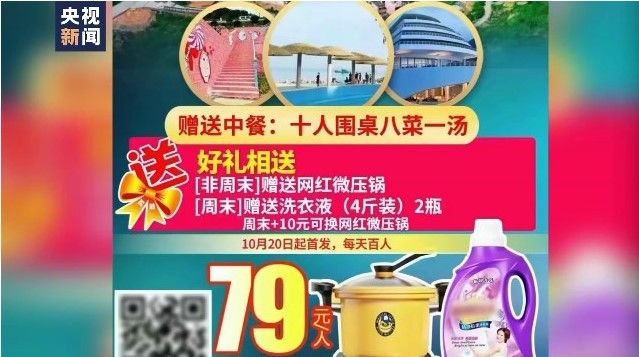 消费体察志愿者 金先生:团费是79元,里面有两个优惠,一个是返还10元,等到上车的时候他给大家返还;第二是送一个锅,这个赠品大概是九十几块钱,这样算下来就等于是零团费一样。