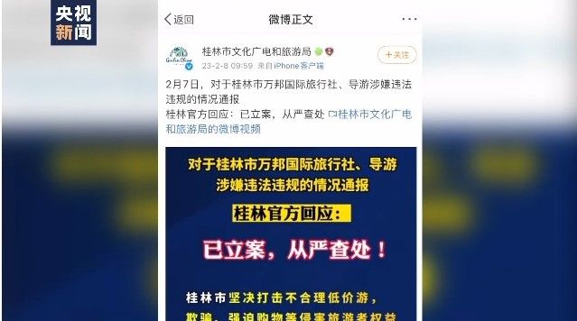调查中记者了解到,视频经网络发酵后,桂林市文化广电和旅游局发布了情况通报,表示经初步核查,涉事旅行社、导游涉嫌“不合理低价游”和强迫或变相强迫购物。对此,桂林市文旅局已立案,将从严查办。