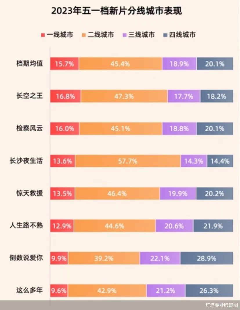刚刚过去的“五一”档中,军事题材《长空之王》是一线城市票房占比最高的影片,《检察风云》《长沙夜生活》二线城市票房占比远超其他影片,喜剧片《人生路不熟》和爱情片《这么多年》《倒数说爱你》下沉表现突出。