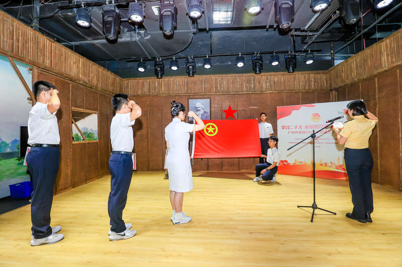 入团仪式上,广州市白云艺术中学为新老团员带来了一场红色话剧表演——《启航》。该剧从青年视角出发,通过户外交互体验、对白、朗诵等舞台艺术表现形式,演绎团一大在广州召开的故事。观看后,新团员王子乔说,“仿佛身临其境,追随革命先辈的步伐成为了其中一分子,真切感受到了革命先辈的热血青春。”之后,新老团员们共同参观了团一大纪念馆,深入学习党领导下的中国青年运动史。