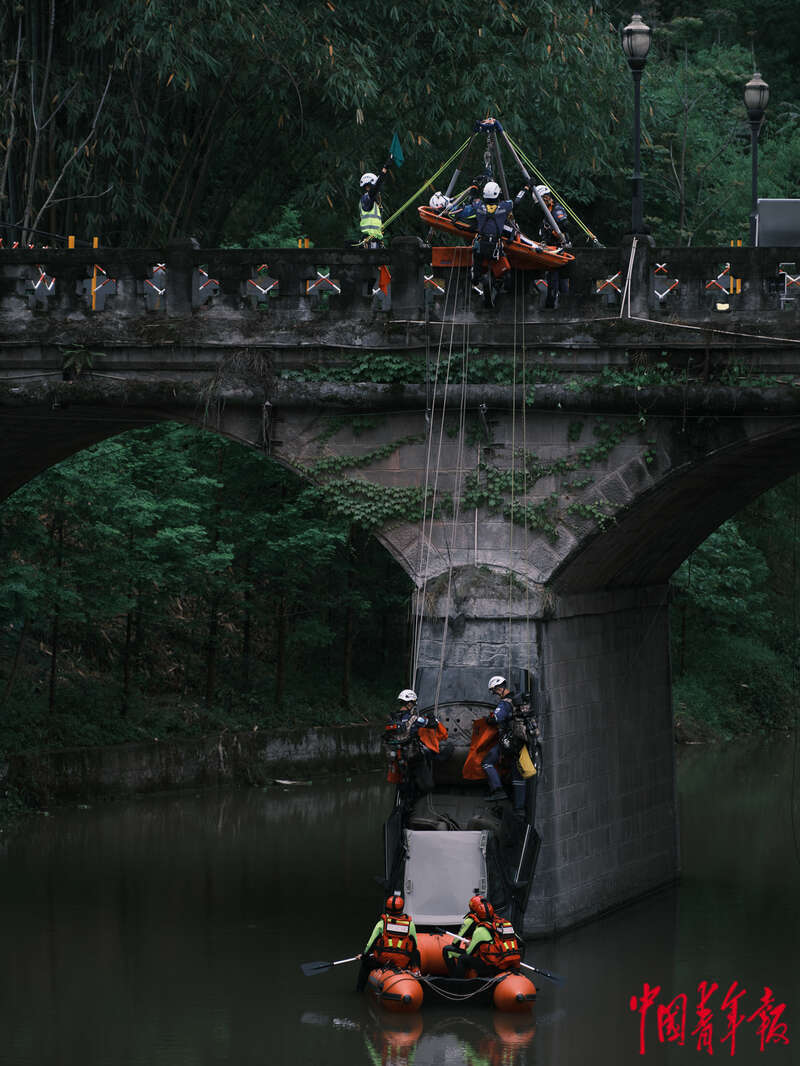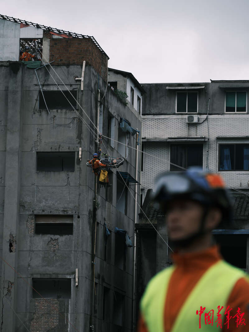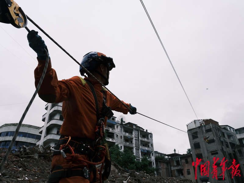 5月8日,四川省乐山市沐川县,四川省森林消防总队消防员正在利用绳索系统演练转移楼顶受困人员。程雪力/摄