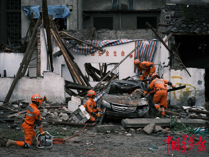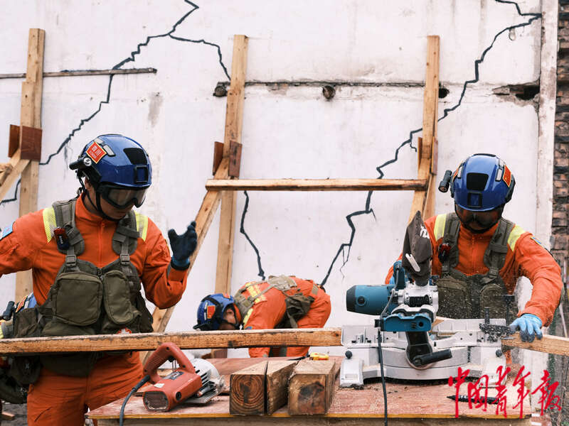 5月8日,四川省乐山市沐川县,四川省森林消防总队消防员采取L型支撑技术对整个墙面进行加固演练,保证救援通道安全顺畅。程雪力/摄
