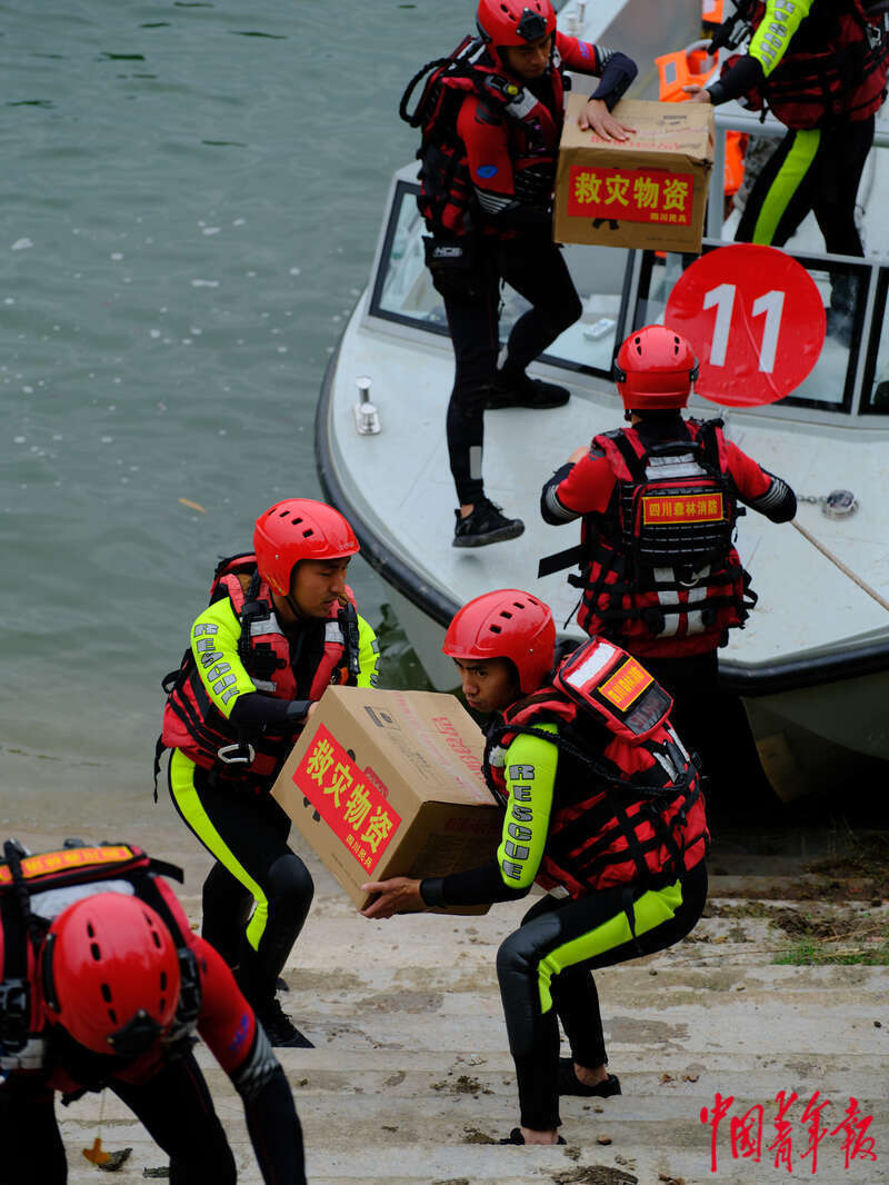 5月8日,四川省乐山市沐川县,四川省森林消防总队特勤大队一中队在舟坝水库进行物资发放和伤员急救演练。程雪力/摄