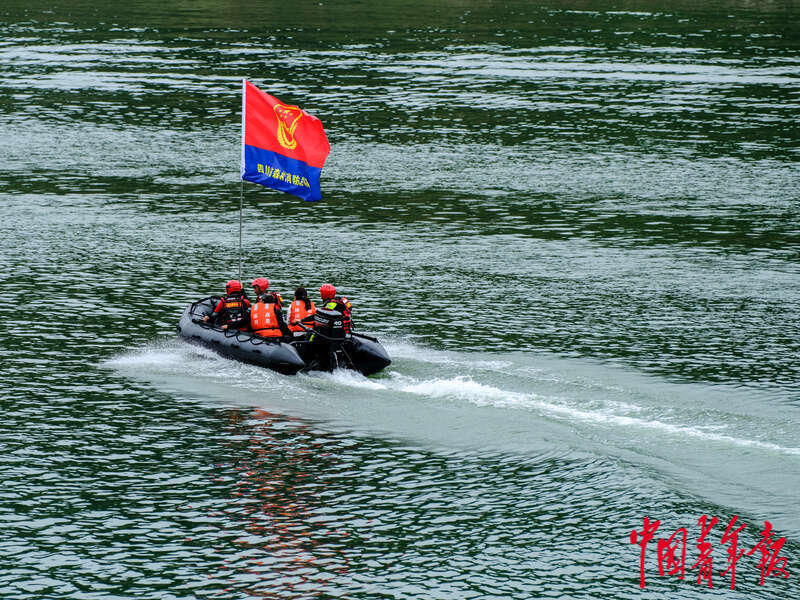 5月8日,四川省乐山市沐川县,四川省森林消防总队特勤大队一中队在舟坝水库驾驶充气式救援艇进行转移受困群众演练。程雪力/摄