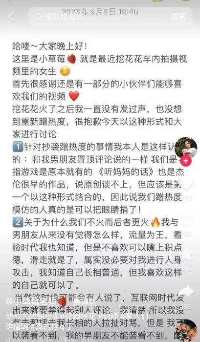 “小草莓老师”也在5月3日发文回应称,不存在谁是原创的问题。