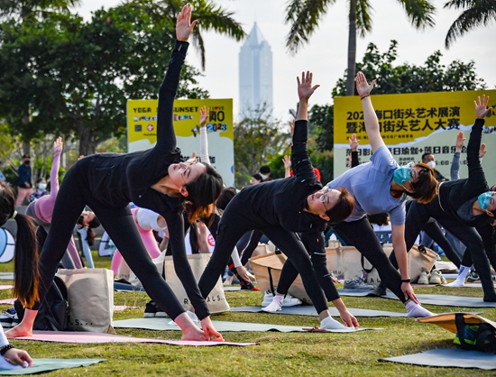 保护颈椎,要将被动放松和主动锻炼结合起来,事半功倍。1月7日,在海口世纪公园云洞图书馆外草坪上,市民在夕阳中感受瑜伽魅力。视觉中国供图
