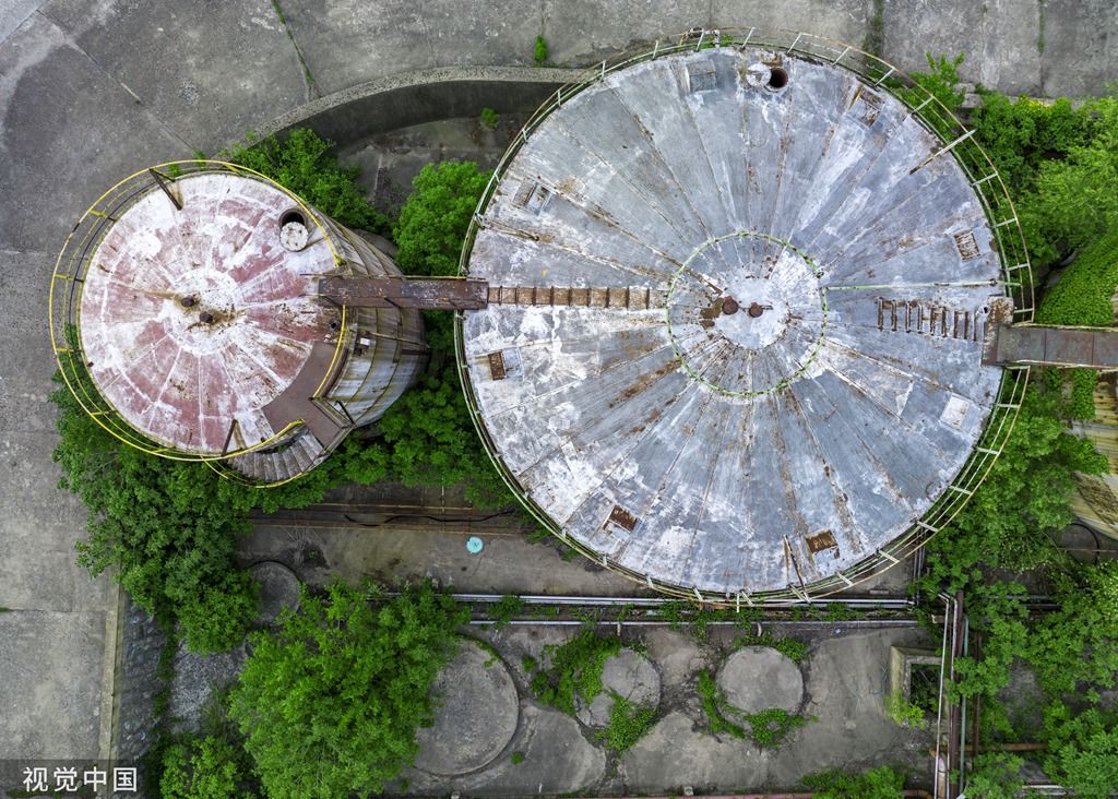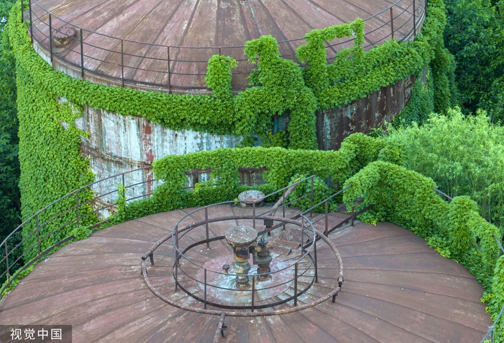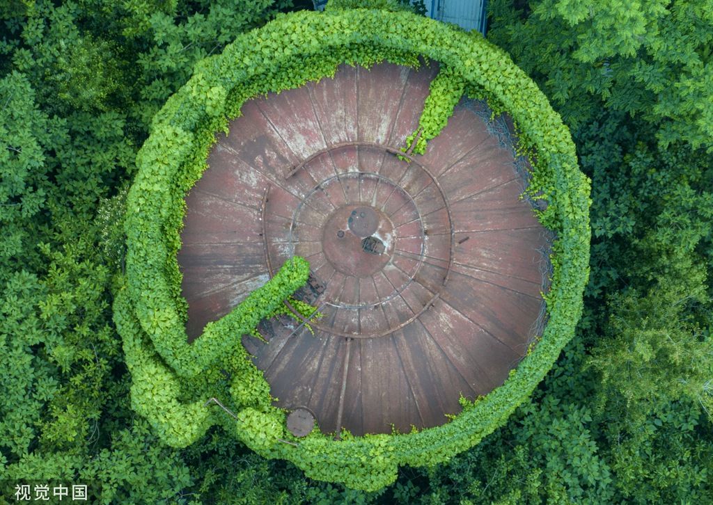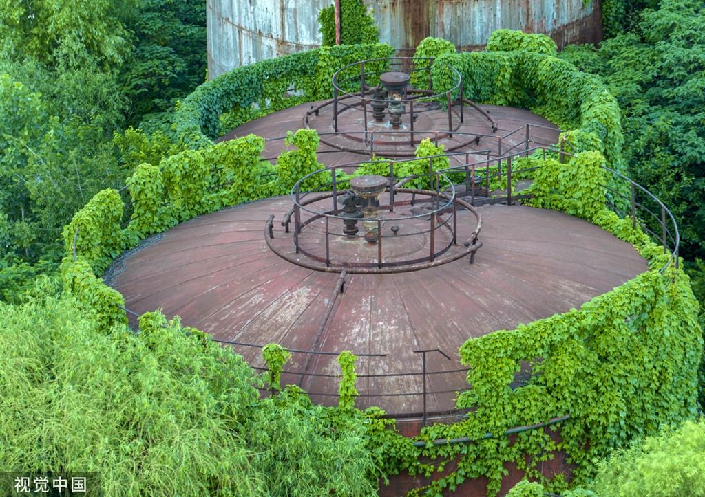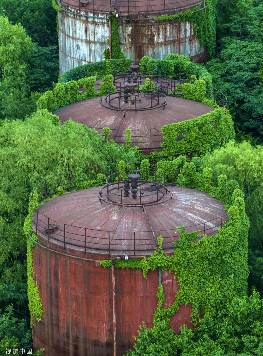 2023年5月9日,江苏淮安,里运河畔一排废弃的油罐长满了爬墙虎,犹如披上一层绿色的外衣,航拍视角下如同绿野仙踪,俨然成了河畔一道靓丽风景。