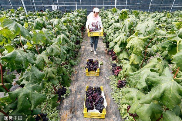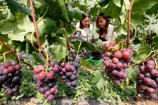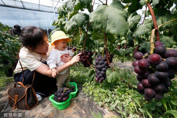2023年5月10日,青岛,即墨区田横镇王村新村,游客在采摘葡萄。
