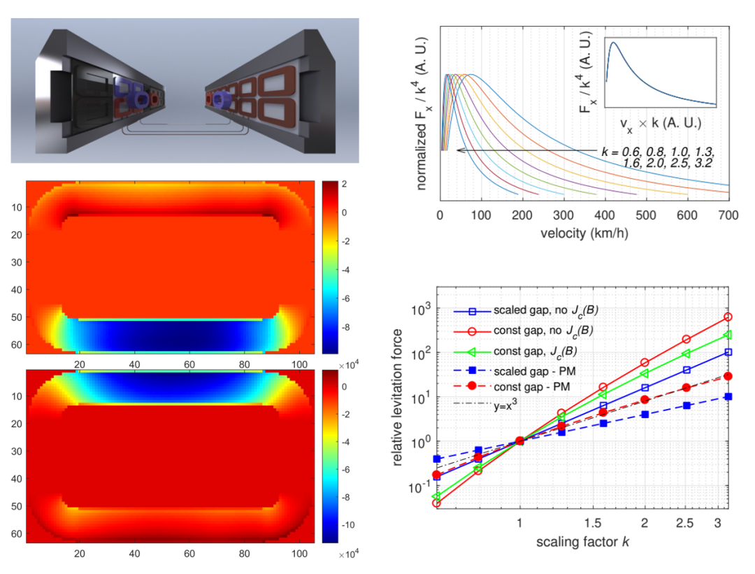 ▲ 车轨耦合悬浮系统模型,线圈瞬时悬浮力分布以及悬浮系统的时间、空间标度率特征(交大团队供图)
