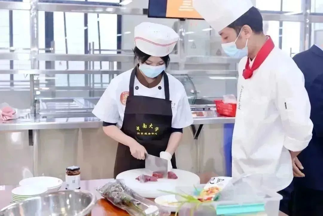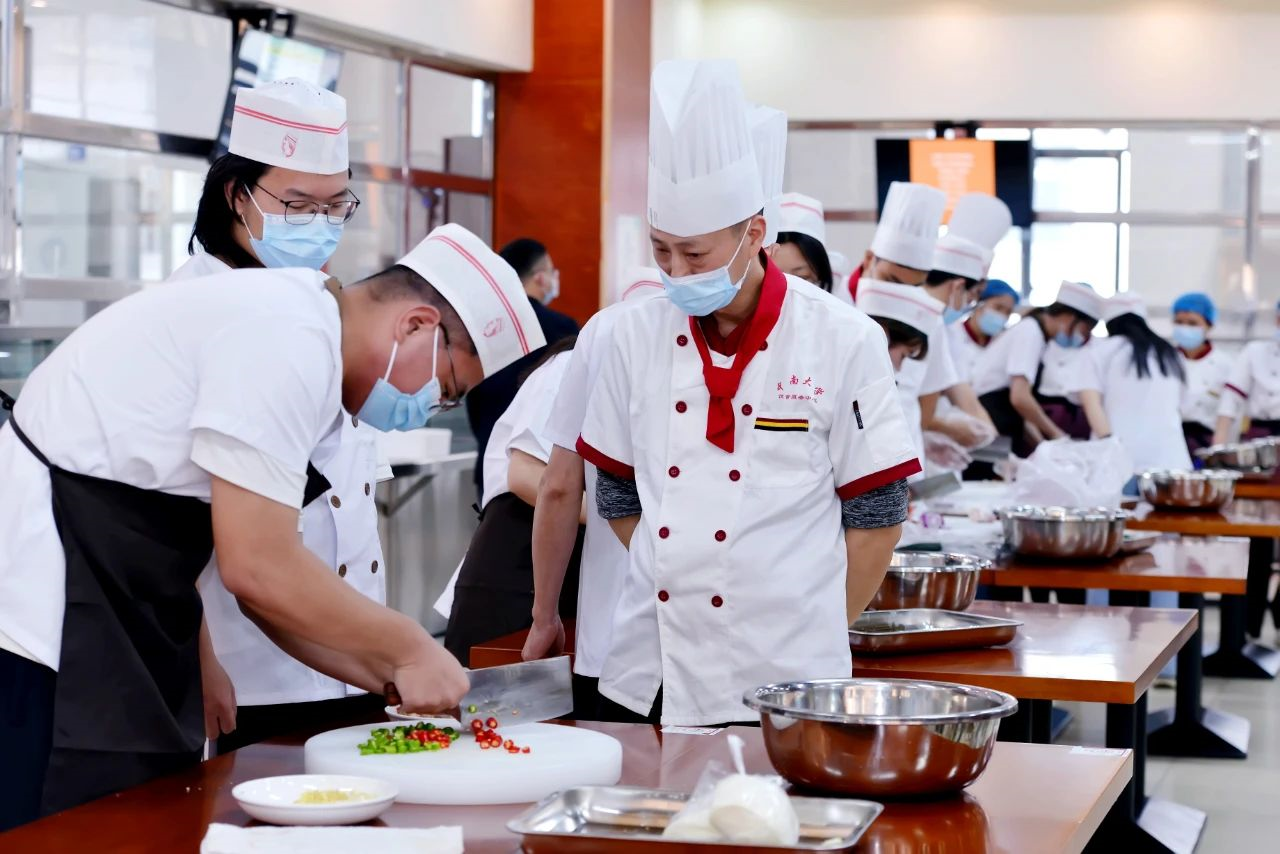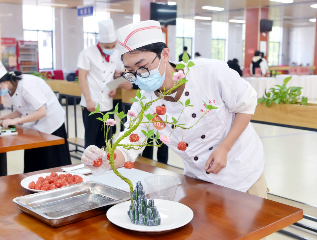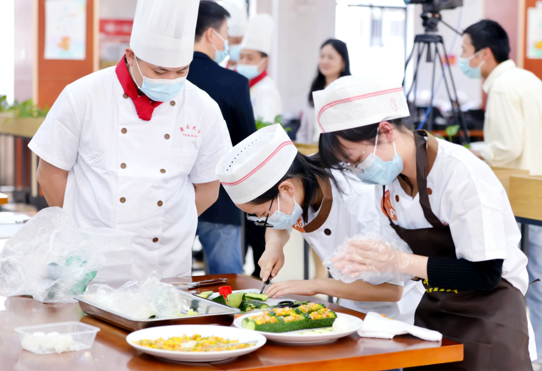切配区,参赛队伍先对所需原材料进行粗加工,鸡鸭鱼肉虾、青瓜菠萝胡萝卜,食材多样,营养丰富。削皮、切块、切丝,或者雕花,参赛学生们熟练地做着菜品准备。