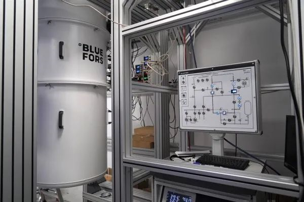走进楼内,穿过狭长的过道、拔地而起的钢架、错综复杂的管线、密集叠放的电路板……就找到了声音的来源——几台日夜工作的稀释制冷机,这是维持超导量子芯片运行所需的制冷设备,也有人把它的轰鸣称作“量子计算机的声音”。