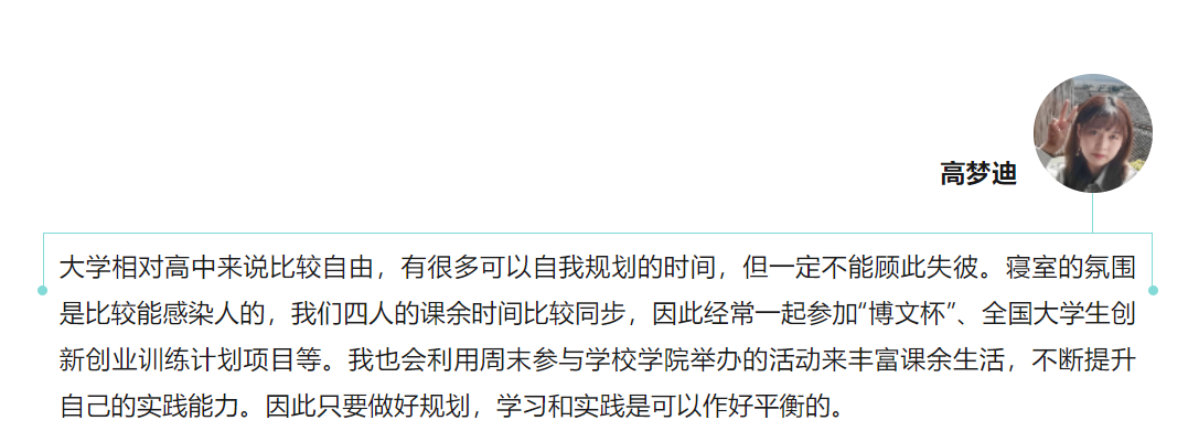 姚子佳作为经济学院分团委人员,在学生工作上尽职尽责,协调各部门工作,帮助优化学院宣传模式;金元作为经济学院院刊《经济学人》副主编,组织院刊的审核和编写工作,也从中进一步提升自身专业素养;高梦迪作为经济学院学生会成员,负责学术活动的策划、组织和宣传等工作,举办了第一届“学蕴中南”诗词大会、第七届财经评论大赛活动。此外,她们四人还一同参与大学生创新创业训练项目、“博文杯”大学生百项实证创新项目、“互联网+”等活动,从中锤炼专业素养,努力将理论与实践相结合。