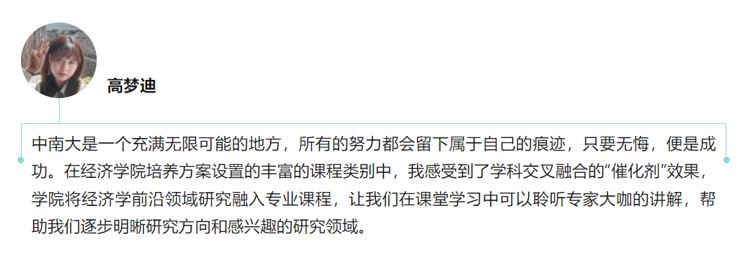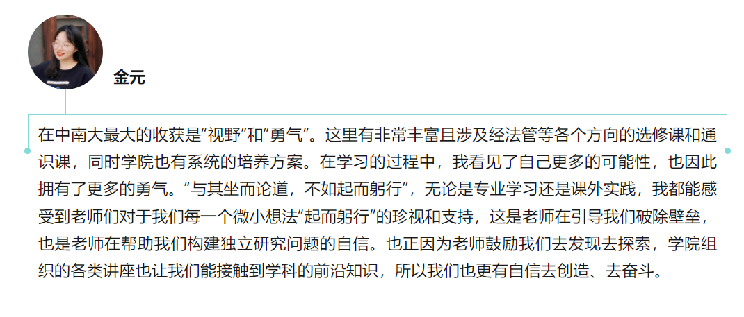 中南大“融通性、创新型和开放式”的人才培养特色以及经济学院“以生为本、分类培养、多元融合”的创新型人才培养方式,使同寝室的四人获益良多。经济学院也通过兴趣引领、学术志趣培育,帮助学生从被动学习、“应试学霸”和“考证达人”向“吸吮式”主动学习和思想启迪转变,为国家培养立足中国大地、具有使命担当、富有创新精神、兼具国际视野的经济学创新型人才。