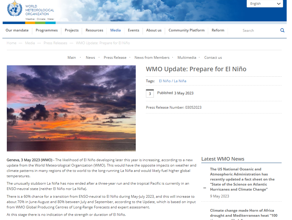 2015年至2022年是有记录以来最暖的八年,也是2015/2016年超强厄尔尼诺以来最暖的状态。尽管过去三年里出现了具有冷却效应的拉尼娜现象,起到暂时遏制全球升温的作用,但厄尔尼诺的发展很可能导致全球气温出现新高峰,并增加打破温度纪录的可能性。