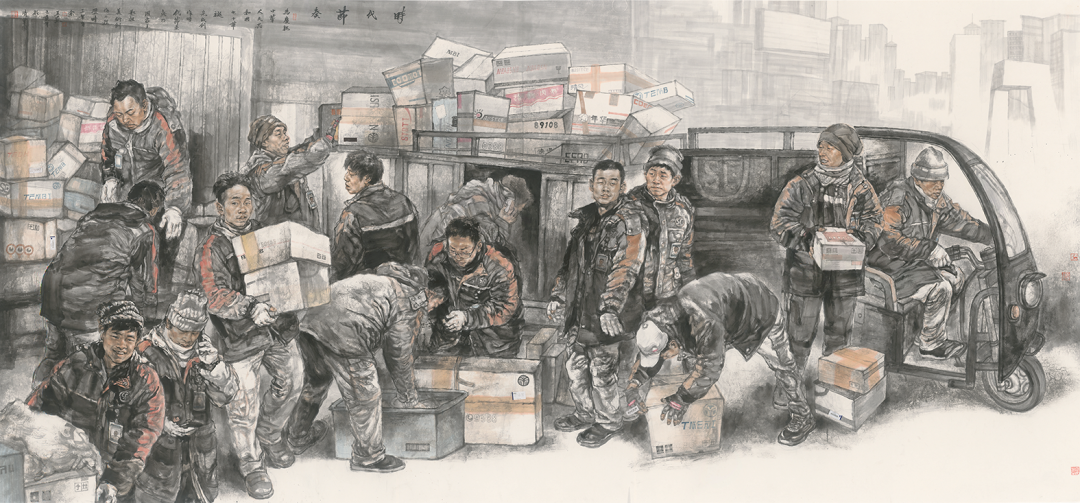 作品通过快递日常的出库、分拣、扫描、派送等细节进行创作,对快递小哥现实生活的关注、体验、理解……用中国人物画艺术表现形式、鲜明的水墨语言、个性化的人物造型,描绘太阳从地平线升起,照亮了城市的尽头,一群快递小哥正要奔赴城市的每个角落……