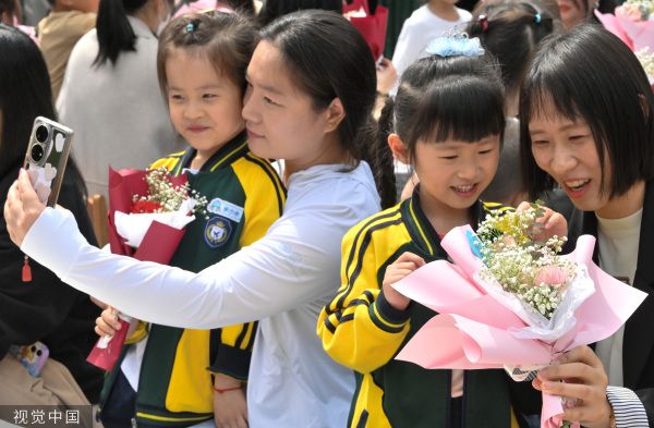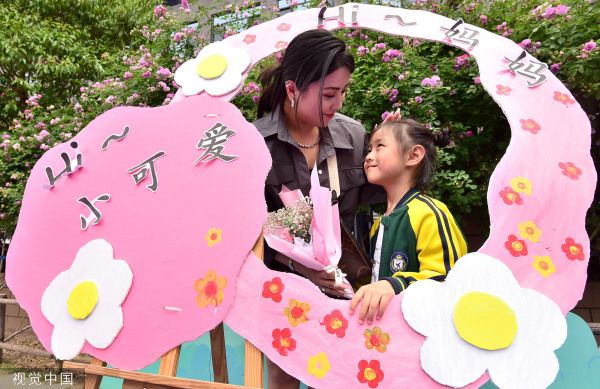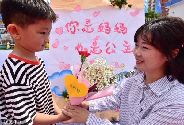 2023年5月10日,河北邯郸,幼儿园的小朋友将制作的插花送给妈妈。