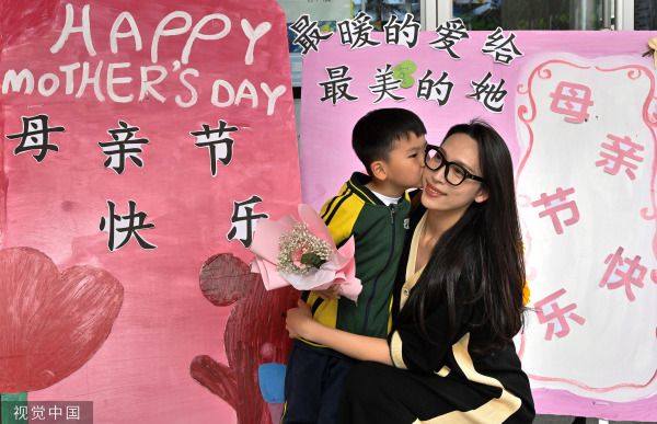 2023年5月10日,河北邯郸,在幼儿园的母亲节亲子插花活动上,一名小朋友亲吻妈妈。