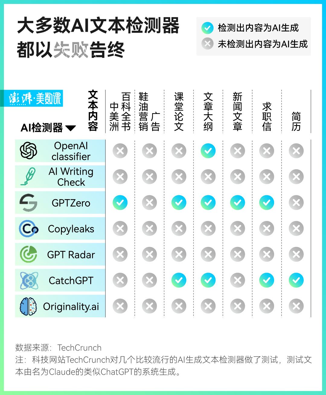 科技网站 TechCrunch 曾在 2 月份用类似 ChatGPT 的聊天机器人 Claude 生成了 7 段不同风格的文字,来测试几个比较流行的 AI 文本检测器的“侦查能力”。结果,没有 AI 检测器能够通关。