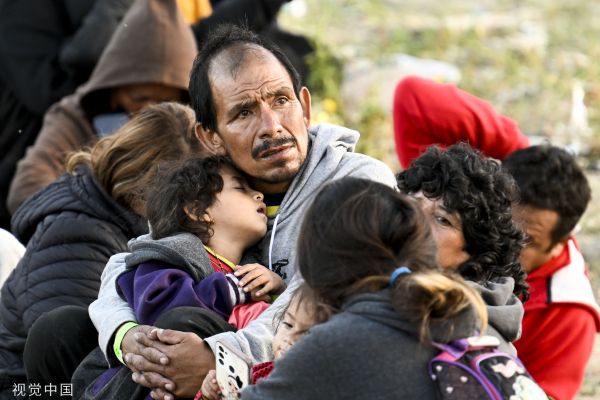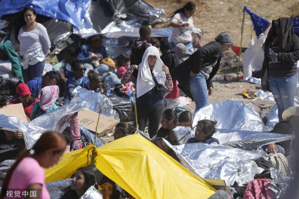 当地时间2023年5月11日,美国加州圣迭戈,等待在两堵边境墙之间申请庇护的移民向墙外张望。