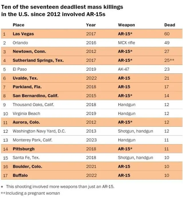 以下血淋淋的死亡人数仅仅是AR-15在美国造成的一部分悲剧,这些数字背后是美国枪商、拥枪团体和利益共享者的算计,更是美国一个个破碎的家庭和很多民众终身难以愈合的创伤。