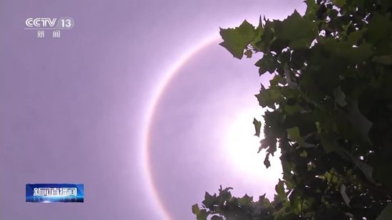 华中科技大学物理学院副教授 邱涛涛:它的原理本质上跟我们通常看到的彩虹很类似,高空中它可能会有一些水蒸气,水蒸气的密度比较大,温度比较低,有可能会形成一些冰晶,太阳光经过这些冰晶的时候也会被折射,恰好形成一定的角度,通常来说是22°的比较多,就会在它周围产生这样一个光环。