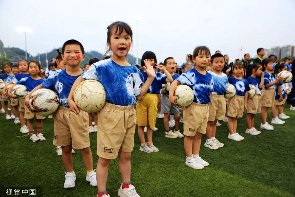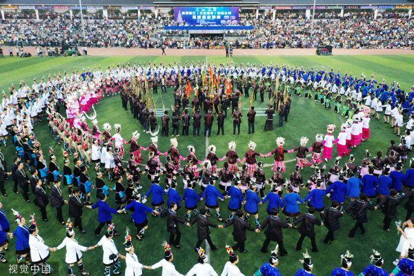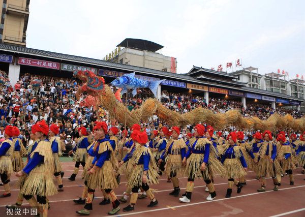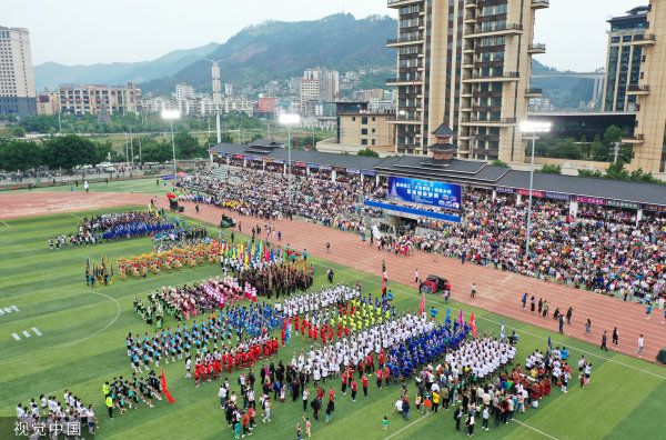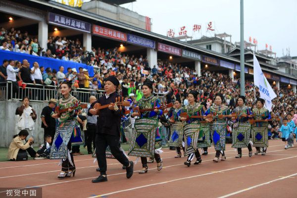 2023年5月13日,贵州黔东南,由群众自发组织的贵州省榕江(三宝侗寨)和美乡村足球超级联赛在城北新区体育场热闹开赛,20支足球队、村寨少数民族群众啦啦队,以及广大球迷上万人到场参加开幕式并观看比赛。