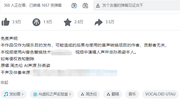 所谓“AI孙燕姿”就是通过模型训练和后期处理,让AI用孙燕姿的声音翻唱其他歌手的歌曲。类似的视频,如今在社交平台上十分常见。