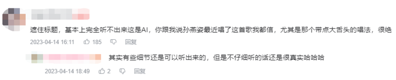 目前来看,这位“AI孙燕姿”的作品包含从流行到民谣等多种风格。由于“AI歌手”与真人演唱的音色并无二致,一些孙燕姿的忠实粉丝感慨“已经很难分清到底是歌手本人还是AI”,一些粉丝表示:“连换气声都能清晰听到,咬字尾音都非常像本人。”