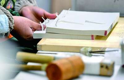 工人在安徽宣城泾县丁家桥镇一家宣纸企业内制作宣纸线装书。新华社发