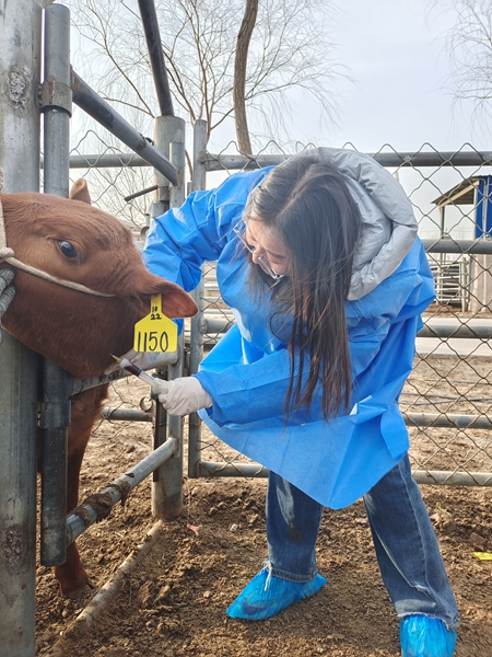 闵胜男去年刚入学就被派到了科技小院,本科修读兽医专业的她却是第一次接触“大动物”,轮岗的第一站也是“兽医岗”,牛圈很大,有几十头牛,兽医一定要下圈,近距离观察牛的状态。“上千斤重的牛,和我差不多高,我害怕他会往我这边冲撞。”闵胜男告诉记者,当时就是心一横,“没办法,只能下。”现在,她已经能自如地在牛圈里穿梭了。