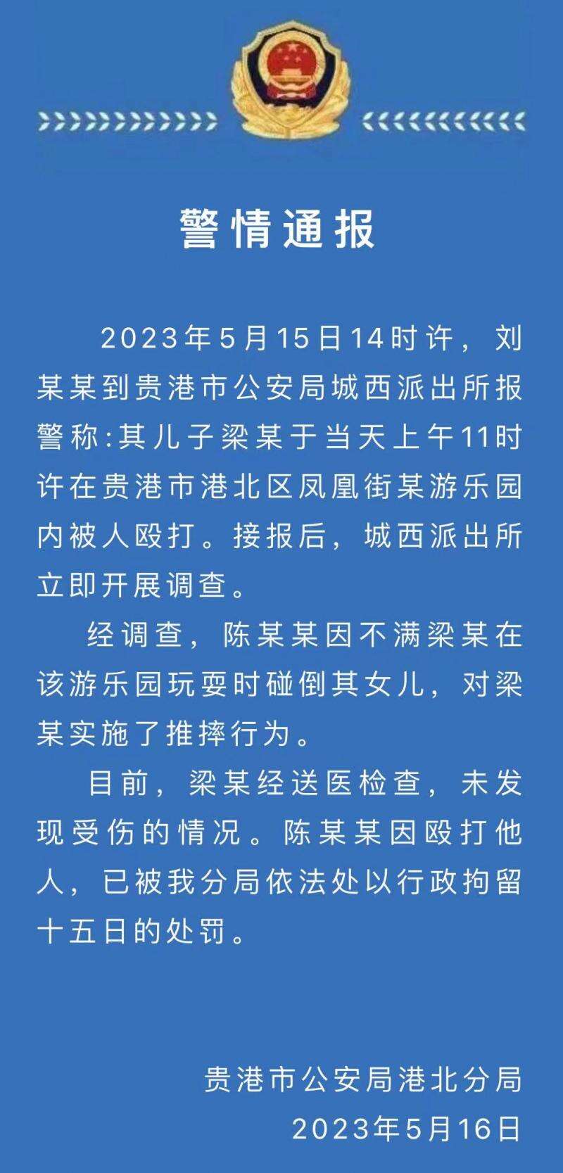 5月15日,一段男子在室内儿童乐园抱摔4岁男童的视频在网上引发关注。据广西贵港市公安局港北分局5月16日通报, 2023年5月15日14时许,刘某某到贵港市公安局城西派出所报警称:其儿子梁某于当天上午11时许在贵港市港北区凤凰街某游乐园内被人殴打。接报后,城西派出所立即开展调查。