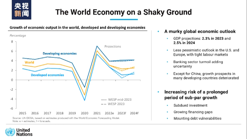该报告还显示,在通货膨胀居高不下、利率上升和不确定性加剧的情况下,全球经济强劲复苏的前景仍然黯淡,世界经济仍面临长期低增长的风险。