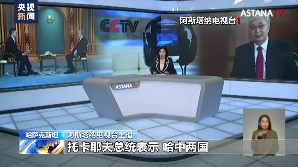 阿斯塔纳电视台主播:托卡耶夫总统表示,哈中两国在政治、经济、人文领域的合作发展为解决国际社会目前面对的问题提供了思路。