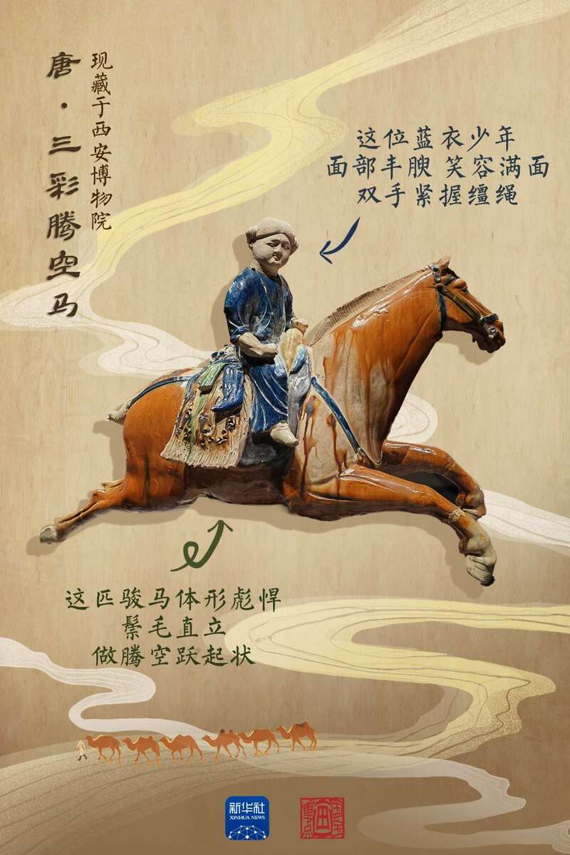 1000多年前,一位来自西域的“蓝衣少年”,穿过茫茫戈壁、广袤沙漠,抵达长安。这位“蓝衣少年”,是西安博物院“明星”藏品——唐代三彩腾空马之上的骑手。“他”,也见证了这场跨越千年的文明交融。