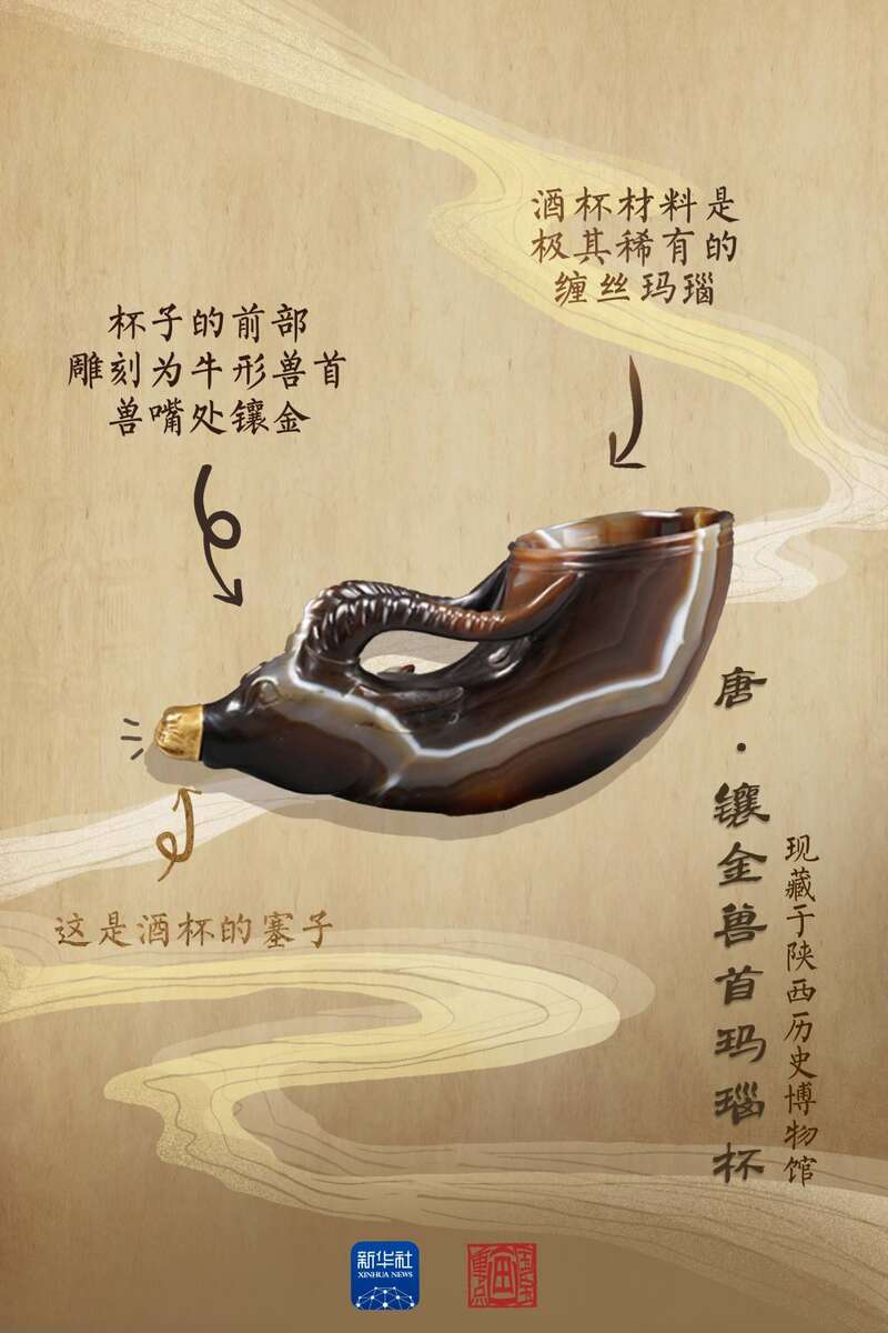 这件镶金兽首玛瑙杯,被列为我国禁止出境的珍贵文物之一。角状杯体由一整块极为罕见的红色缠丝玛瑙雕琢而成,整个杯体高6.5厘米,长15.6厘米,口径5.6厘米,其造型与起源于古希腊的酒具“来通”相似,“来通”曾广泛流行于中亚、西亚地区,沿着丝绸之路不断东传进入中国。