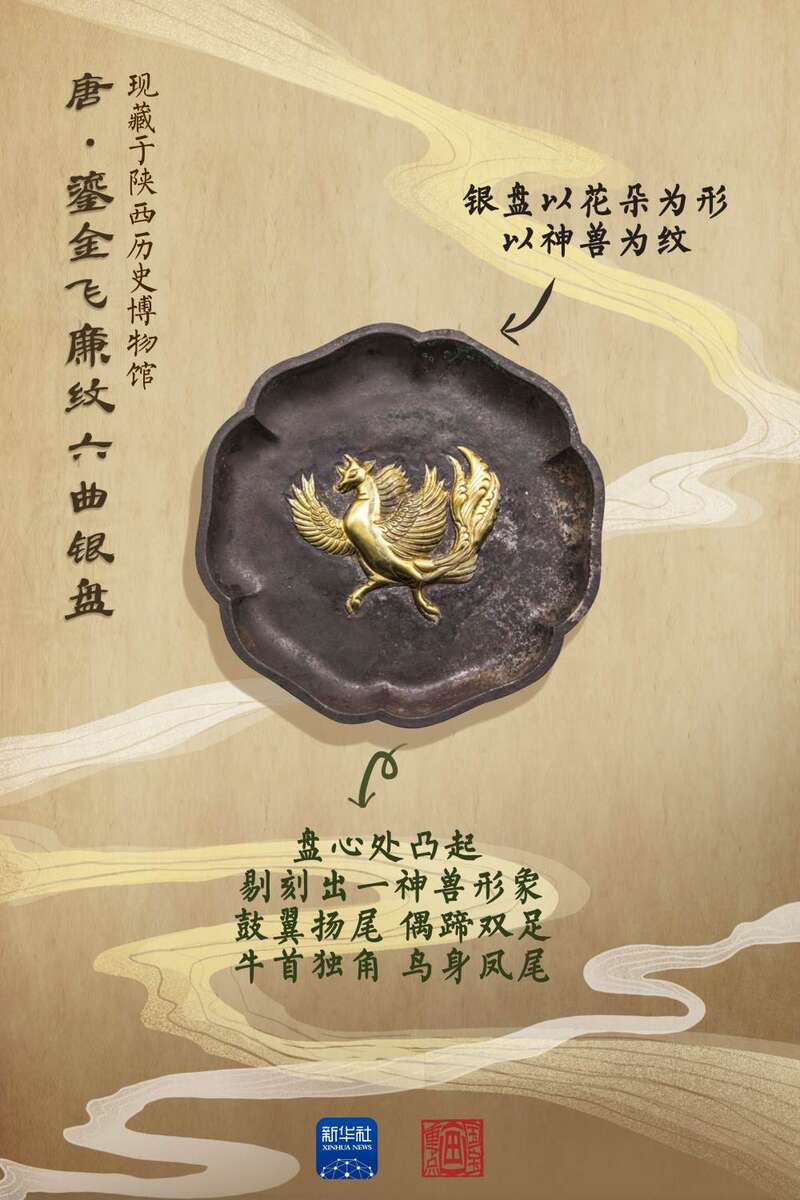 1970年10月,在西安市南郊何家村的工地上,施工人员偶然发现了一处文物窖藏,随后在这里清理出千余件唐代珍宝。这件鎏金飞廉纹六曲银盘制作考究、工艺典雅、纹饰独特,盘心的神兽形象为飞廉,是中国古代神话传说中的风神。这件银盘构图借鉴了中亚粟特的艺术手法,但题材却是中国纹样,反映出唐代工匠在借鉴西方金银器艺术的基础上,更加注重推陈出新。