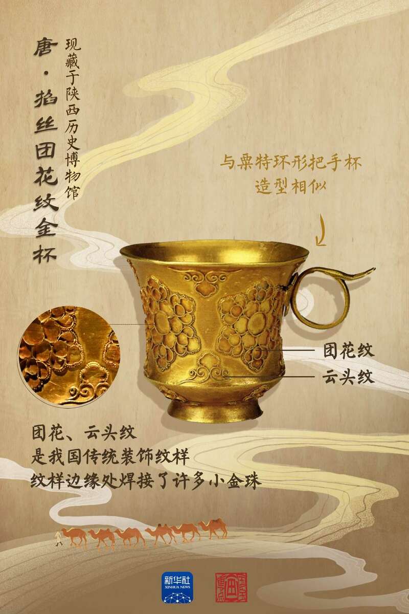 唐代部分带把杯直接来自中亚粟特,还有部分属于唐人仿制粟特风格的作品。在打磨光滑的杯身上,焊接了四朵黄金质地的细丝编成的团花,即团花纹;每朵团花纹的间隙,还用同样的制作方式焊接了像云朵一样的纹饰,即云头纹。团花纹与云头纹是我国传统的吉祥图案,此金杯也是东西方文明通过丝绸之路进行交流互鉴的珍贵物证。