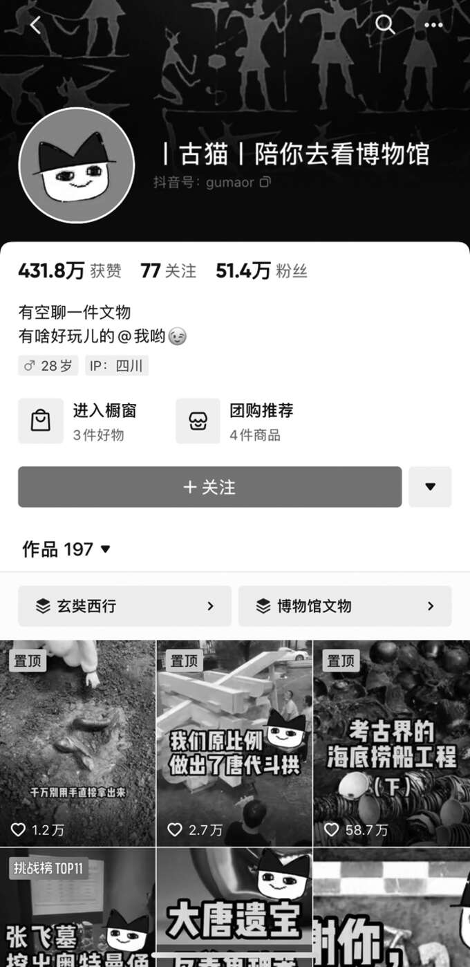 “古猫|陪你去看博物馆”这个账号诞生于2021年,两年时间,全网已有超百万粉丝。“最初我们做过博物馆自助讲解服务,后来抖音流行起来了,我也来刷了刷,感觉这是一个对文物类知识科普传播非常有利的平台。”汤诗伟说,文博科普与其他科普不同,不看到文物长什么样是没办法完整了解文物的,而短视频平台则提供了一个友好的传播方式,比过去语音、文字的科普传播都要便捷,“我们博物馆不应该是立在那等观众去发现,我们要主动出击,于是就有了做短视频向大家展示文物的构想。”