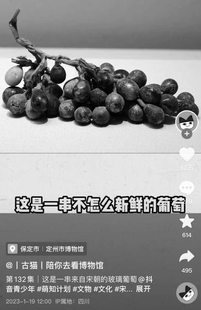 “一串不怎么新鲜的葡萄,确实不新鲜,看着像前天的,不是前天的,是前1000年的。”这是讲解宋朝文物玻璃葡萄;“这是唐代张旭的《肚痛帖》,这真是中国书法史上的yyds(永远的神)啊”……近日,一个名叫“古猫|陪你去看博物馆”的短视频账号火了,博主一边捧哏一边逗哏,穿插着各种表情包和有趣的“梗”来讲述科学严谨的历史文博知识,幽默风趣,通俗易懂,收获了不少年轻观众的喜爱。