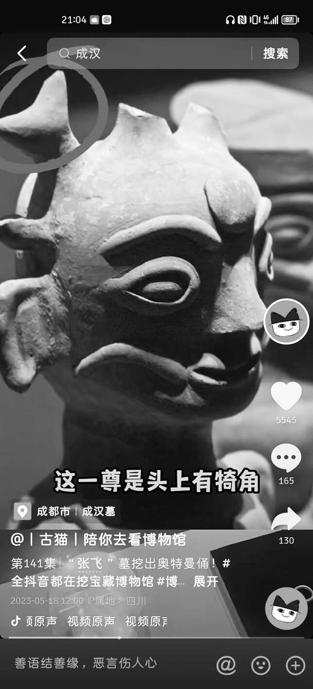 “一串不怎么新鲜的葡萄,确实不新鲜,看着像前天的,不是前天的,是前1000年的。”这是讲解宋朝文物玻璃葡萄的;“这一堆小人是成都博物馆最丑萌的文物”,这是在讲解桓侯巷成汉墓的陪葬陶俑……这些都是“古猫|陪你去看博物馆”账号中的内容,一边捧哏一边逗哏,各种表情包、有趣的“梗”更是信手拈来。你以为是在看相声小品?其实不然,这是来自北大考古学系的博主汤诗伟“沉浸式”的文物科普,幽默风趣通俗易懂,收获了不少年轻观众的喜爱。