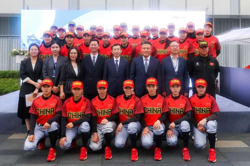 活动现场,参会嘉宾与中国女垒国家队合影。中国垒球协会供图