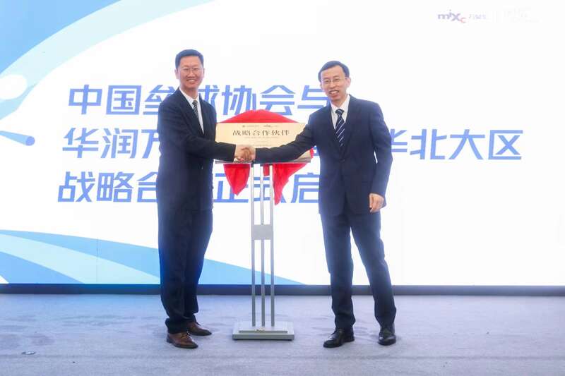 国家体育总局手曲棒垒球运动管理中心副主任、中国垒球协会主席杨旭(右)与华润万象生活商业华北大区助理总经理任东亮分别代表双方进行了战略合作揭牌。中国垒球协会供图