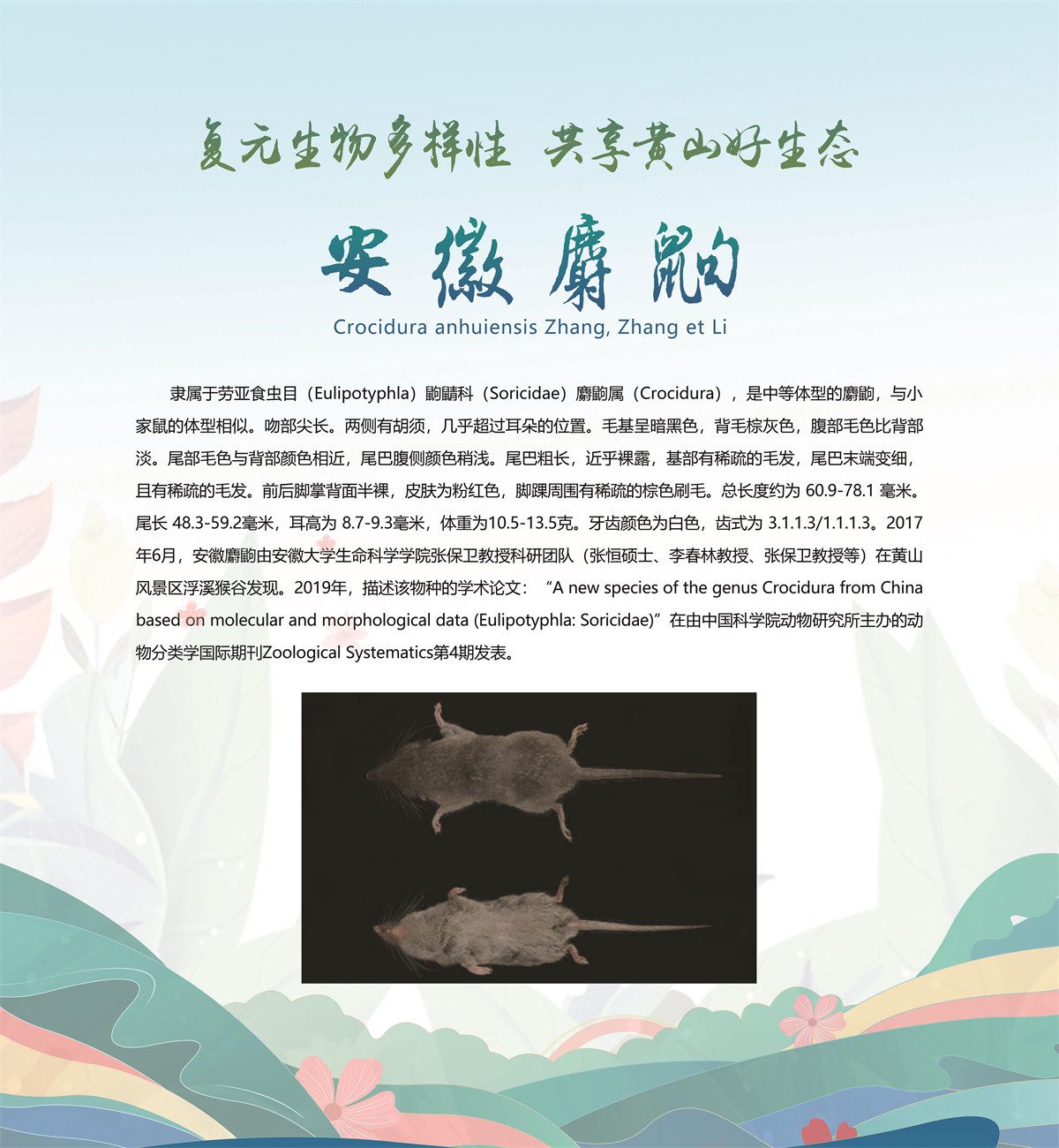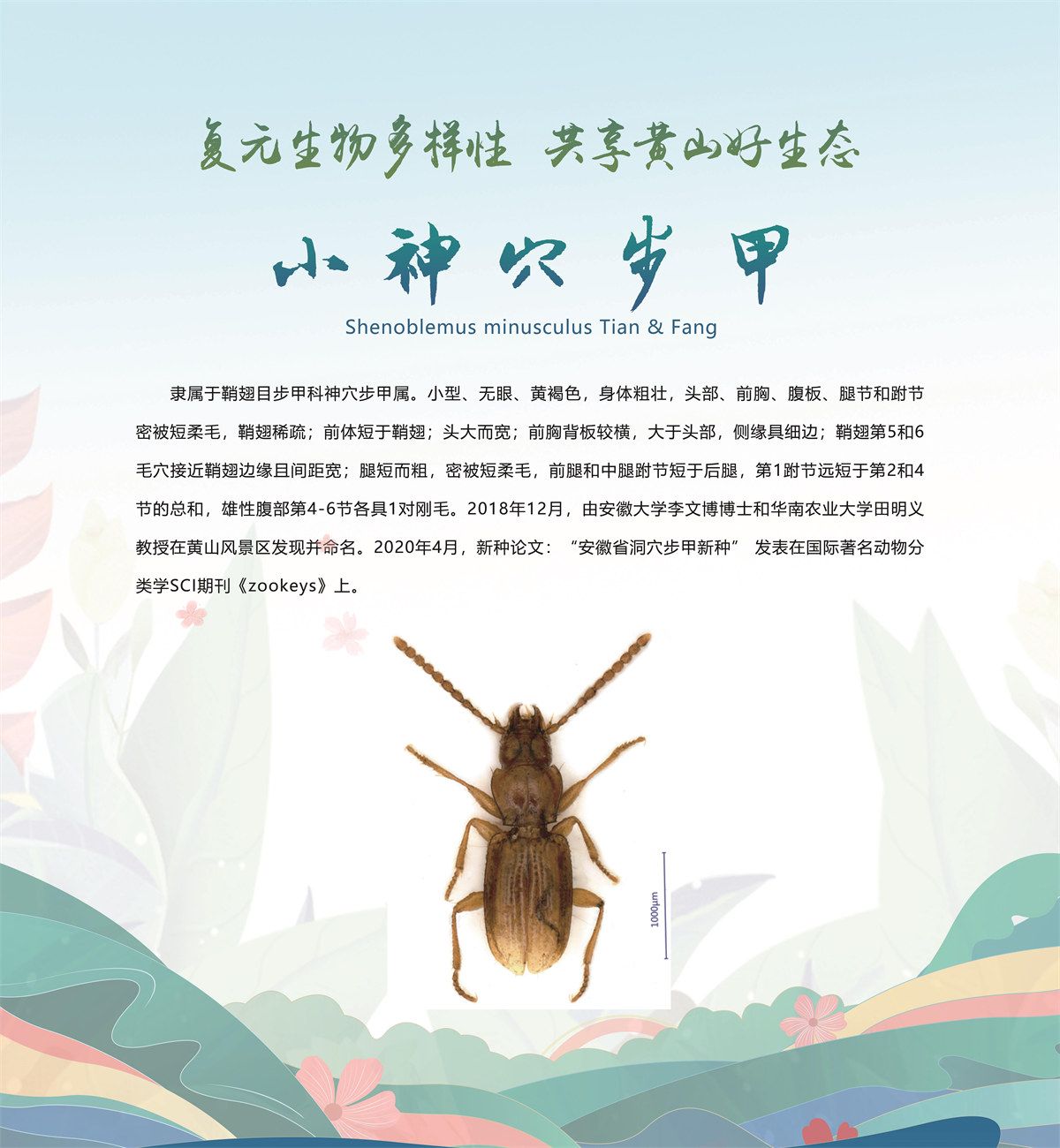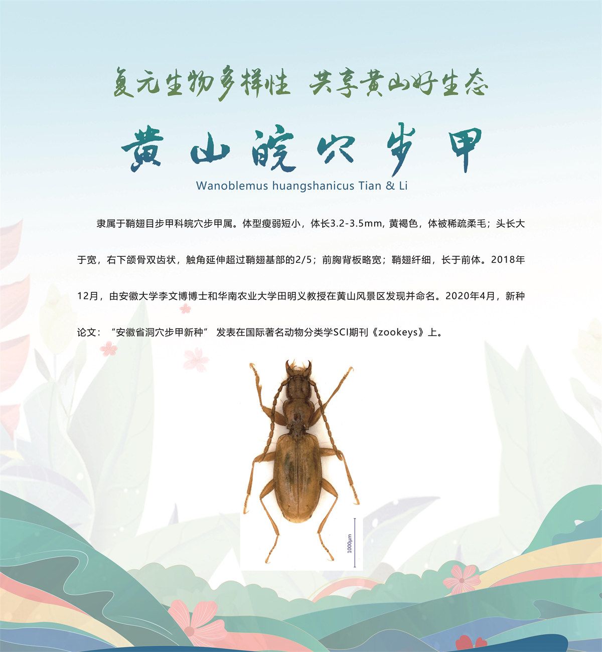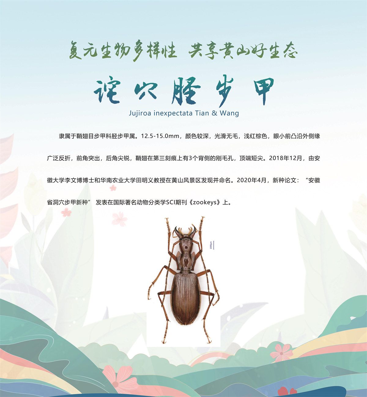 5月20日,安徽省黄山市发布了新近发现的13个全球新物种,分别是牯牛石豆兰、牯牛铁线莲、蔓生景天、黄家岭脊蛇、黄山马蹄鳖、黄山新襀、小神穴步甲、黄山皖穴步甲、诧穴胫步甲、安徽麝鼩、雕鳞松塔牛肝菌、黄山松塔牛肝菌、东方牛排菌,是由安徽大学、安徽师范大学、北京林业大学、扬州大学、华南农业大学、上海市农业科学院、上海市农业科学院食用菌研究所、牯牛降国家级自然保护区管理站等机构联合当地通过8年的专项调查和野外考察,分别在黄山市祁门县、休宁县和黄山风景区发现的,相关新物种科研论文已分别在国际权威期刊发表。