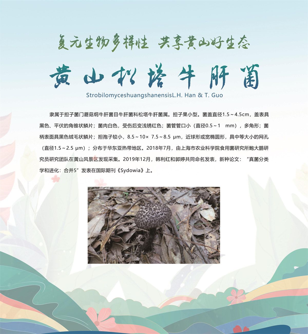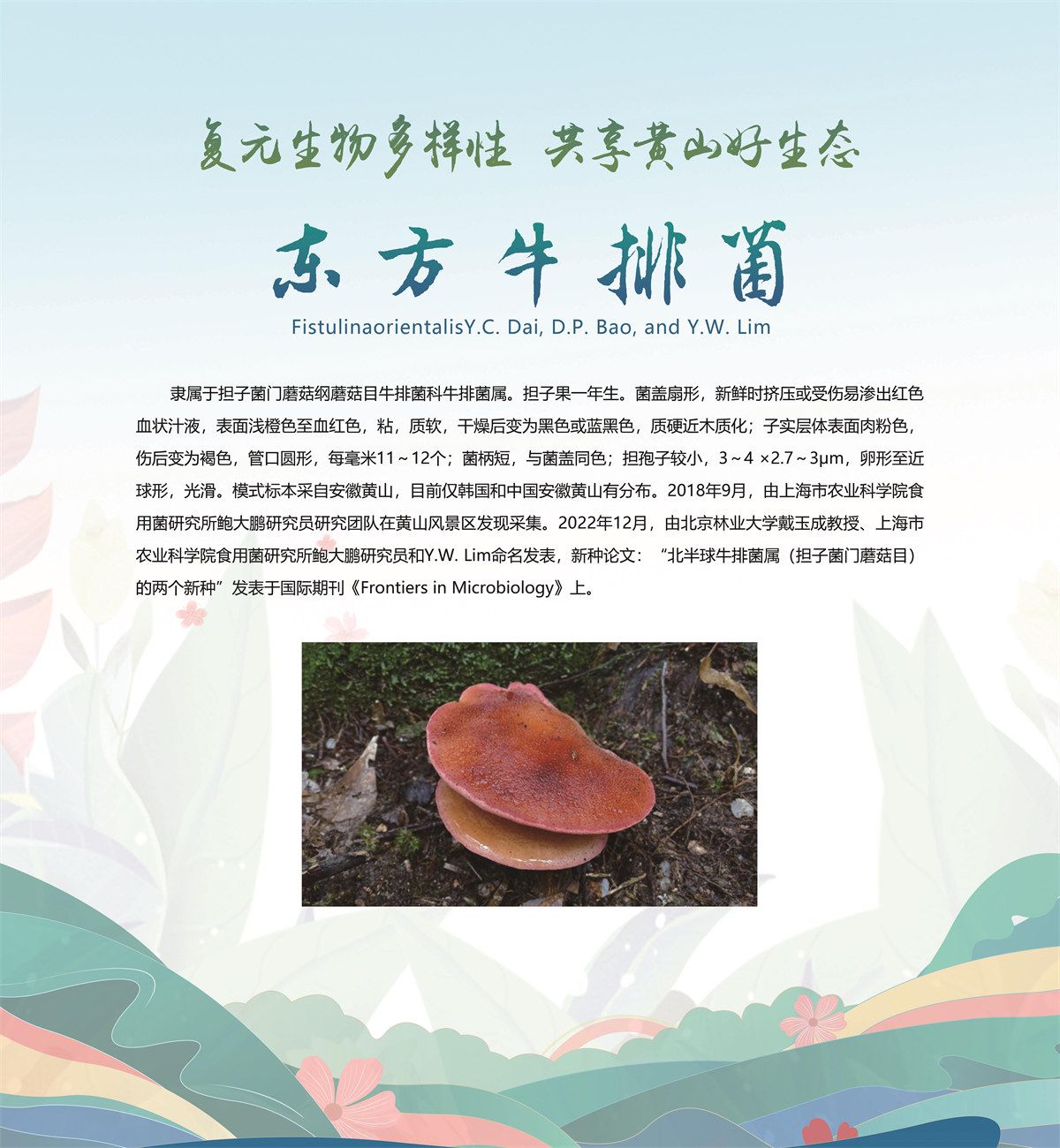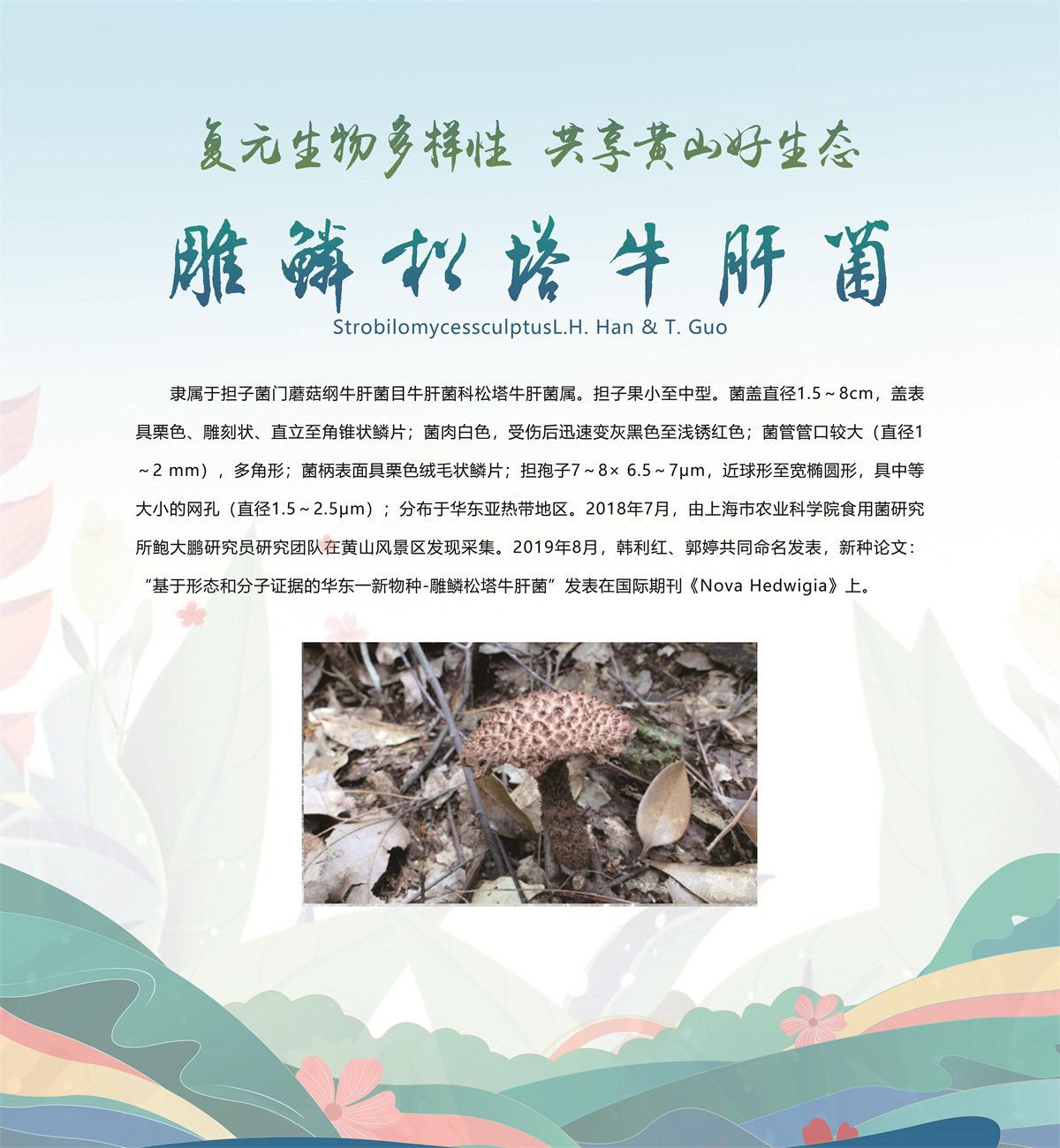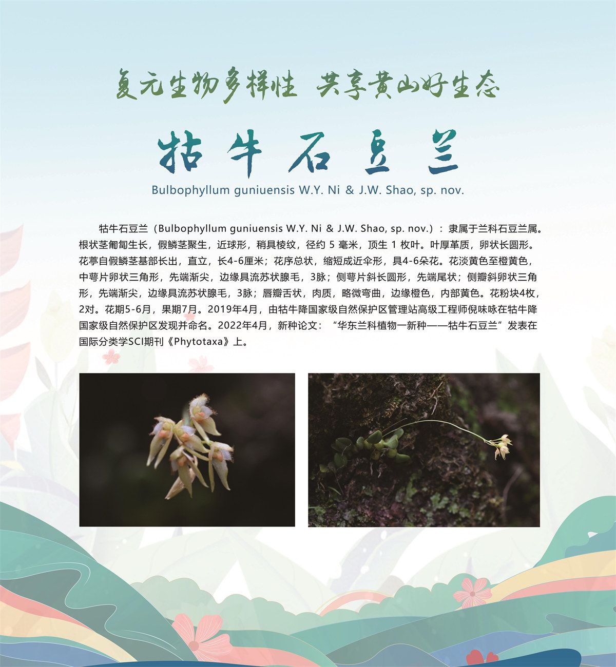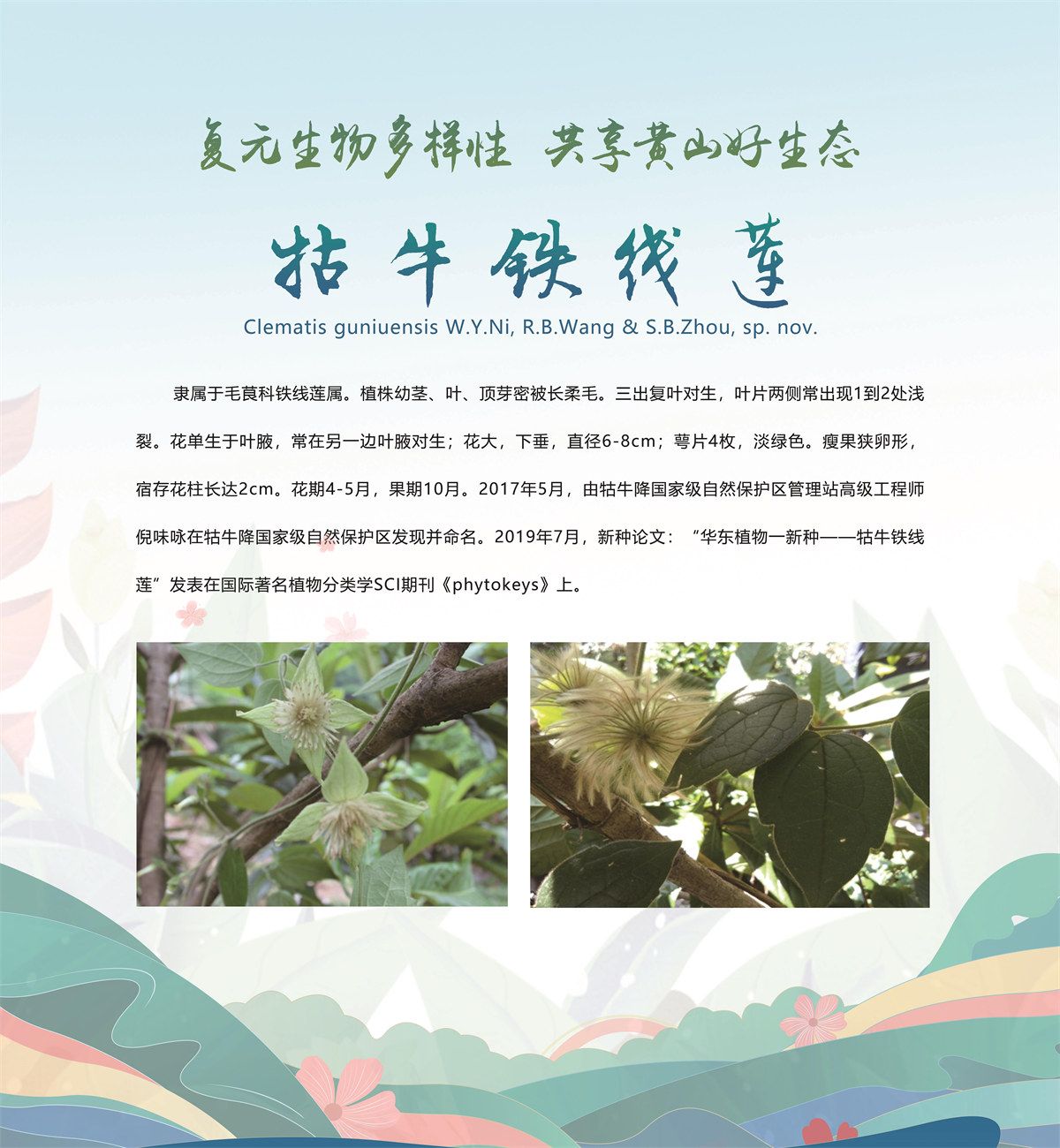 5月20日,安徽省黄山市发布了新近发现的13个全球新物种,分别是牯牛石豆兰、牯牛铁线莲、蔓生景天、黄家岭脊蛇、黄山马蹄鳖、黄山新襀、小神穴步甲、黄山皖穴步甲、诧穴胫步甲、安徽麝鼩、雕鳞松塔牛肝菌、黄山松塔牛肝菌、东方牛排菌,是由安徽大学、安徽师范大学、北京林业大学、扬州大学、华南农业大学、上海市农业科学院、上海市农业科学院食用菌研究所、牯牛降国家级自然保护区管理站等机构联合当地通过8年的专项调查和野外考察,分别在黄山市祁门县、休宁县和黄山风景区发现的,相关新物种科研论文已分别在国际权威期刊发表。