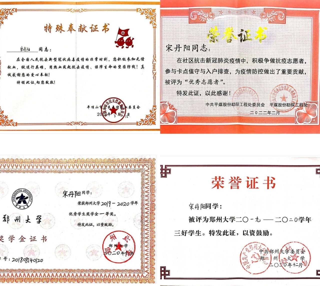 本科在校期间积极进取,认真完成各项课业任务。在学业方面,曾三次获得“郑州大学优秀学生奖学金”;在科研方面,积极参与各项科研项目,并取得丰硕成果:获“全国大学生基础医学创新研究暨实验设计论坛”东南赛区三等奖、“第十二届电子商务三创赛”省级二等奖等;学业之余,也投身到各类丰富的社会实践当中:获得“河南省优秀学生干部”、“郑州大学优秀学生干部”、“郑州大学社会活动先进个人”等荣誉称号;此外,秉持乐于助人的志愿者精神,多次在校内校外志愿活动中做出一定的贡献:曾获得”郑州大学星级志愿者”、“优秀青年志愿者”等称号。