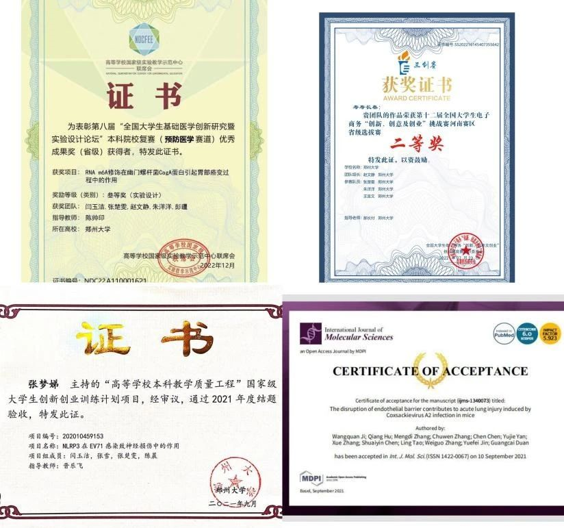 在校期间平均绩点为3.31,曾获国家励志奖学金,郑州大学优秀学生奖学金二等奖、三等奖,郑州大学优秀学生干部,郑州大学三好学生等称号。曾任公共卫生学院辩论队副队长、权益部副部长,获得最佳辩手、部门之星等称号。
