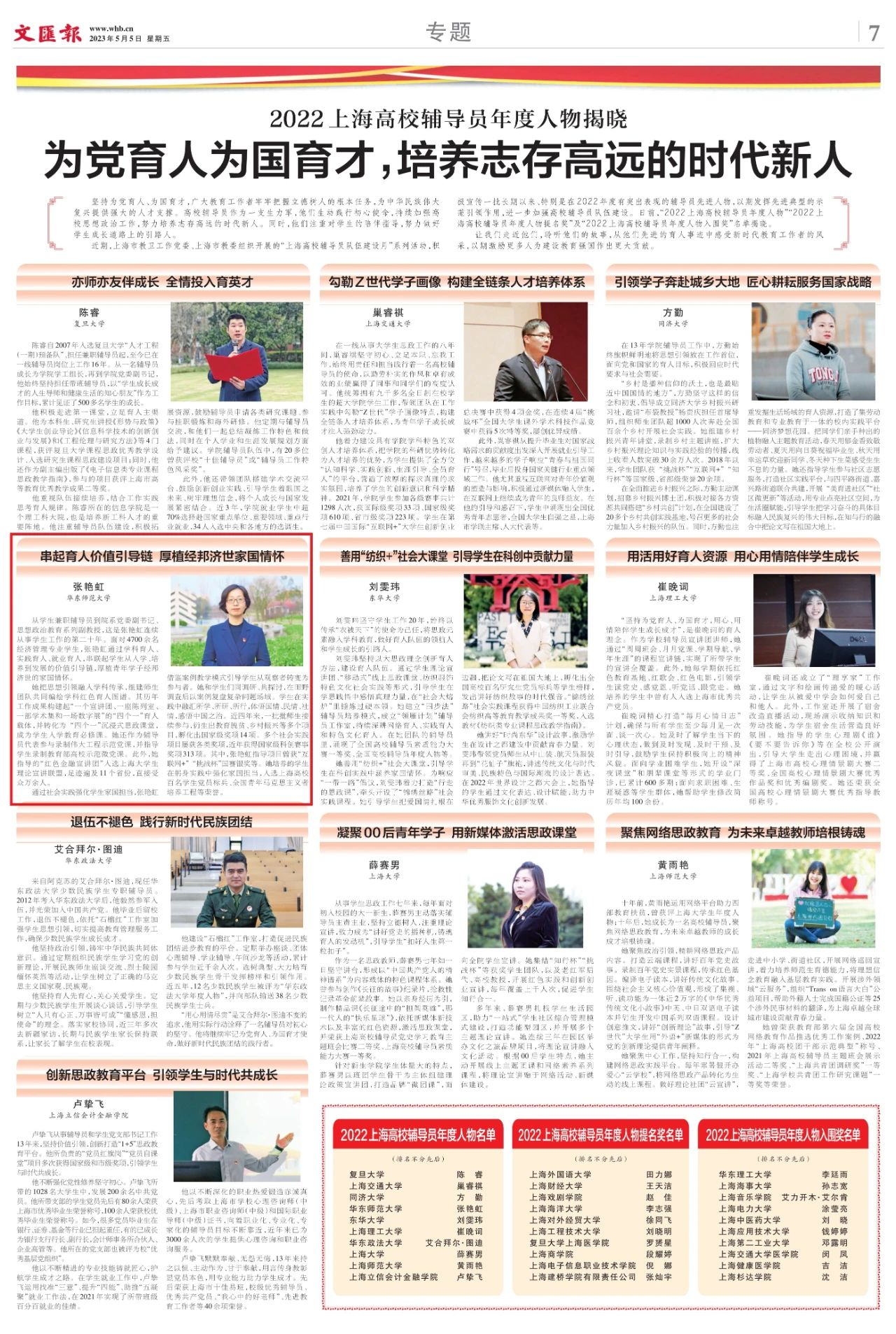 《文汇报》2023年5月5日7版整版报道年度人物事迹