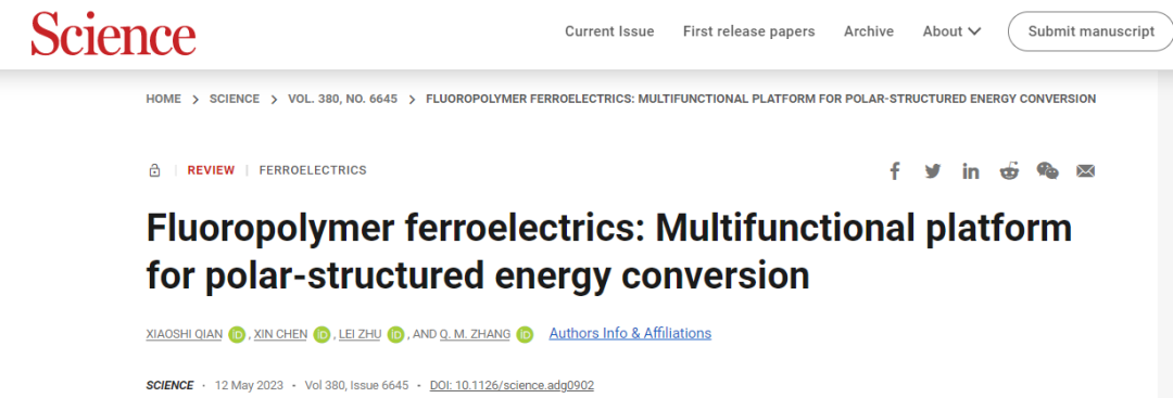 机械与动力工程学院钱小石教授在Science上发表题为“Fluoropolymer ferroelectrics: Multifunctional platform for polar-structured energy conversion”的论文。钱小石教授为第一作者。这是Science自1983年发表首篇铁电高分子综述后,40年后再次刊登铁电高分子领域的综述论文。