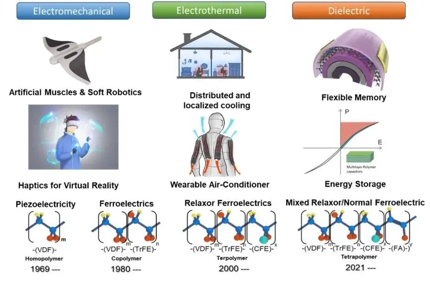 论文对偏氟乙烯(PVDF)基铁电高分子材料在机电耦合、零碳制冷、储能与信息存储等领域的应用进行了系统的分析,提出需要进一步探索铁电聚合物分子结构和极化响应的关系,设计跨尺度缺陷来修饰/操纵极性结构,降低场致相变势垒,以更高效的软物质能量转化促进绿色、智能和元宇宙的生活方式。目前高分子行业的成熟制程可以为快速生产、迭代未来的先进功能高分子薄膜器件带来便利,有望在即将到来的元宇宙的触觉感知、机器人应用中发挥关键作用,更可作为平板或可穿戴空调的固态制冷工质,提供目前市场上其他产品无法提供的可穿戴、轻量化、低能耗的主动冷热调控能力。